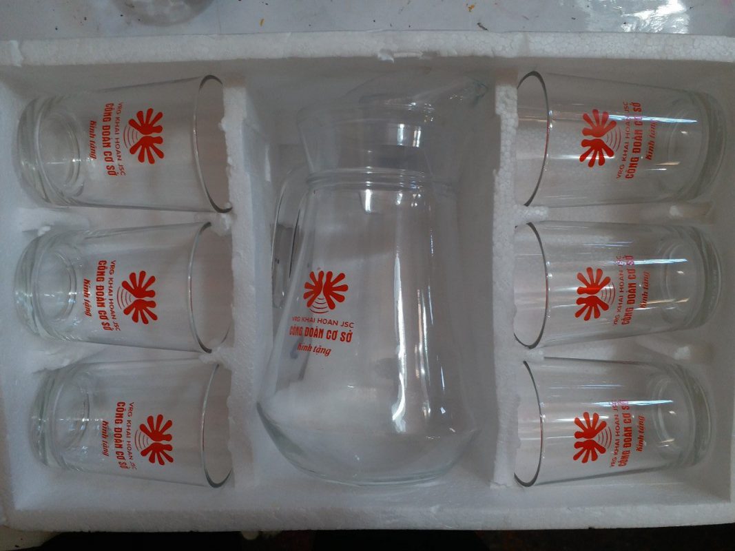 In bộ bình ly thủy tinh có nhiều thương hiệu như Indonesia, Ocean Thái lan, Luminarc. Dòng sản phẩm được làm bằng chất liệu thủy tinh cao cấp, an toàn cho sức khỏe con người. In bộ bình ly thủy tinh bao gồm 1 bình và 4 ly hoặc 6 ly. Quý khách có thể chọn những bộ sản phẩm có hoa văn hoặc trơn để in logo, tên thương hiệu trên sản phẩm để tri ân cho khách hàng trong các sự kiện để quảng bá doanh nghiệp.
